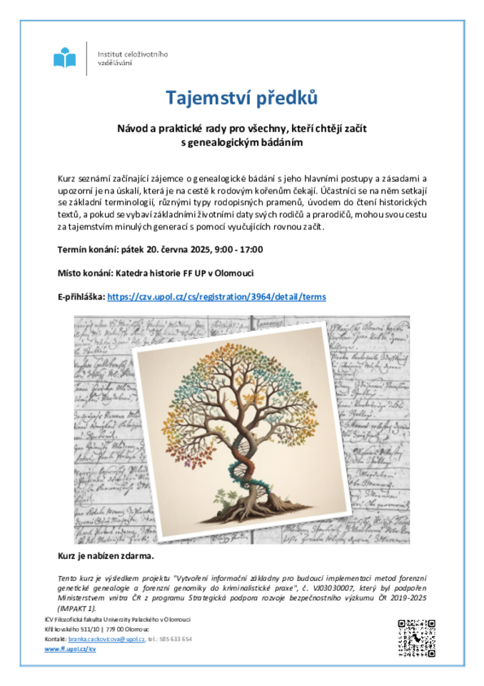 Záměrem kursu je přiblížit postup a zásady genealogického bádání začátečníkům, a to včetně úskalí, která je na cestě k rodovým kořenům čekají. Účastníci budou seznámeni s různými typy rodopisných pramenů. Pozornost bude věnována také čtení historických textů a interpretaci konkrétních zápisů, stejně tak jako orientaci v genealogické terminologii a možnostech zpracování výsledků bádání.