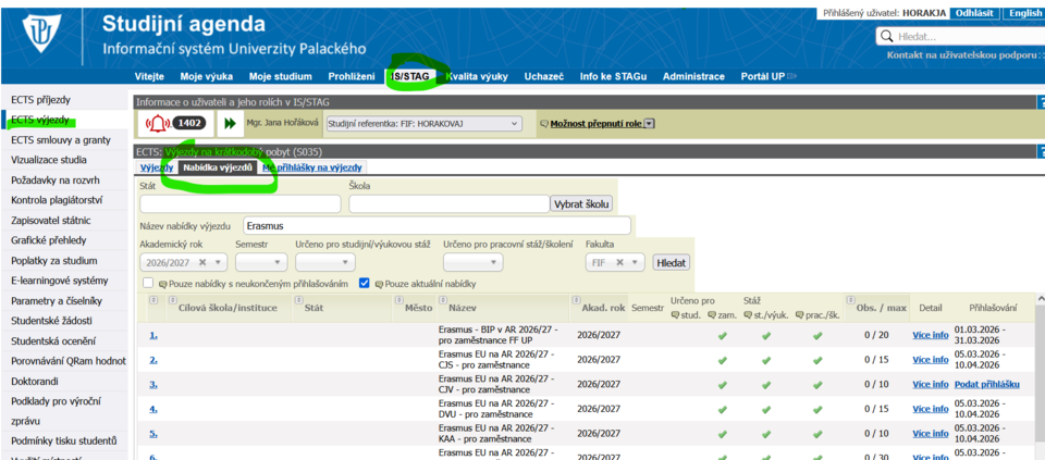 Kontaktní osoba pro výjezdy zaměstnanců na FF UP: Jana Hořáková nebo katederní koordinátor pro zahraničí