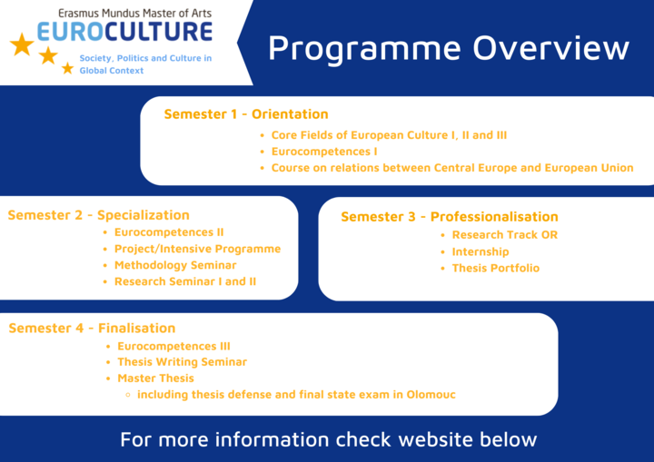 Here you can find information about each semester of Euroculture programme. All the information are both general and applicable to the whole consortium, and also specific for Euroculture in Olomouc.