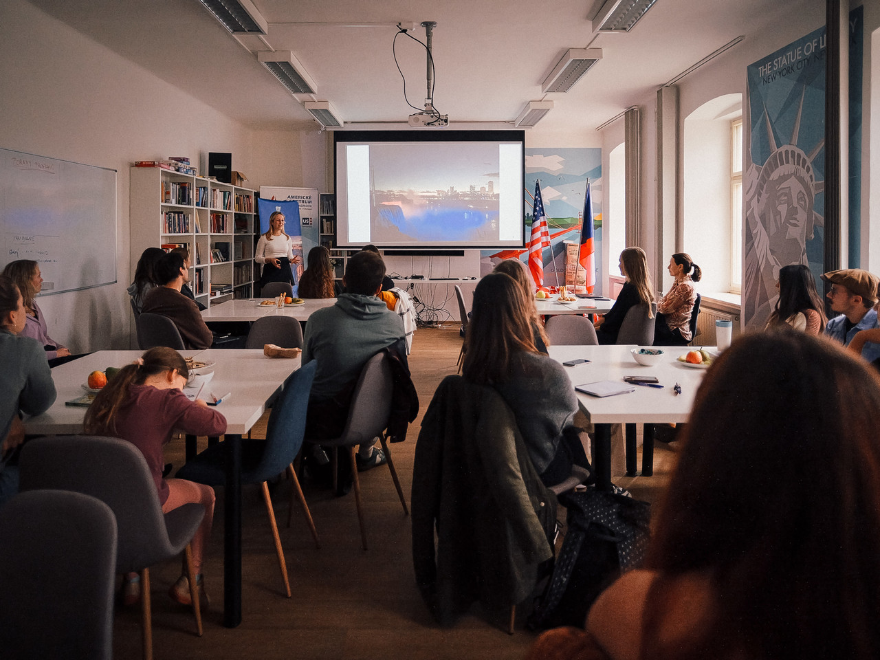 Ve středu 15. října odpoledne jsme otevřeli dveře našeho oddělení a uspořádali přátelské setkání s koordinátory programu Erasmus a také při této příležitosti představili Merrillův program, který nabízí stipendia pro studium na partnerských univerzitách v USA. Publikum zcela okouzlily absolventky Merrillova programu sdílením svých zkušeností se studiem v USA. Výzva pro podávání přihlášek na Merrillův program v akademickém roce 2026/2027 je aktuálně otevřena až do 8. prosince 2025. Momenty ze setkání zachytil fotograf Vojtěch Kmenta.