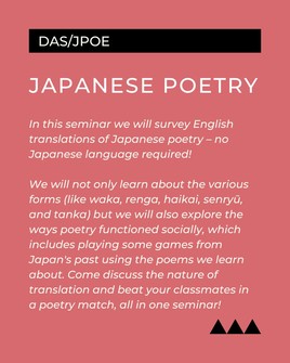 In this seminar, students will explore English translations of major forms of Japanese poetry, including waka, renga, haikai, senryū, and tanka. Beyond examining poetic forms, the course also looks at the social roles poetry played in Japan’s past. Participants will even get to try out traditional poetic games, using the poems studied in class.