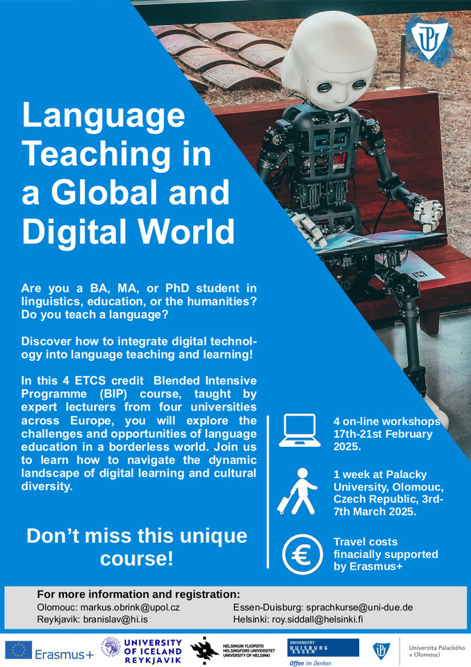 Between 3rd and 7th March the next course took place: “Language Teaching in a Global and Digital World.” More than 30 students plus staff from Olomouc, Helsinki University, Duisburg-Essen University and the University of Iceland met at the Faculty of arts to discuss and learn about globalization and digital language learning. Among the very interactive activities during the course we practiced how to use AI in language learning, how to find the best practices for classes in the on-line environment and how to use diversity as an advantage in learning. The course will be used as the beginning of further cooperation, opening up further opportunities for students to improve the language skills in new environments.