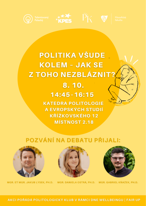 Moderovaná debata pořádaná studentskou organizací Politologický klub UP propojí svět politologie a psychologie. Odborníci na politický marketing, data a lidskou psychiku společně rozeberou, jak sledování veřejného dění ovlivňuje naši mysl i každodenní pohodu. Jak nás formují zprávy, krize a předvolební kampaně? A co s tím můžeme dělat? Akce nabídne prostor pro otázky, reakce i sdílení vlastních zkušeností.