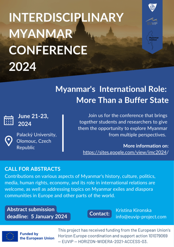 Berlínský Myanmar-Institut e. V. a Univerzita Palackého v Olomouci (zejména projekt „The EU in the Volatile Indo-Pacific Region“ - EUVIP) Vás srdečně zvou k účasti na interdisciplinární konferenci s názvem „Myanmar's International Role: More Than a Buffer State“. Konference se uskuteční ve dnech 21.-23. června 2024.